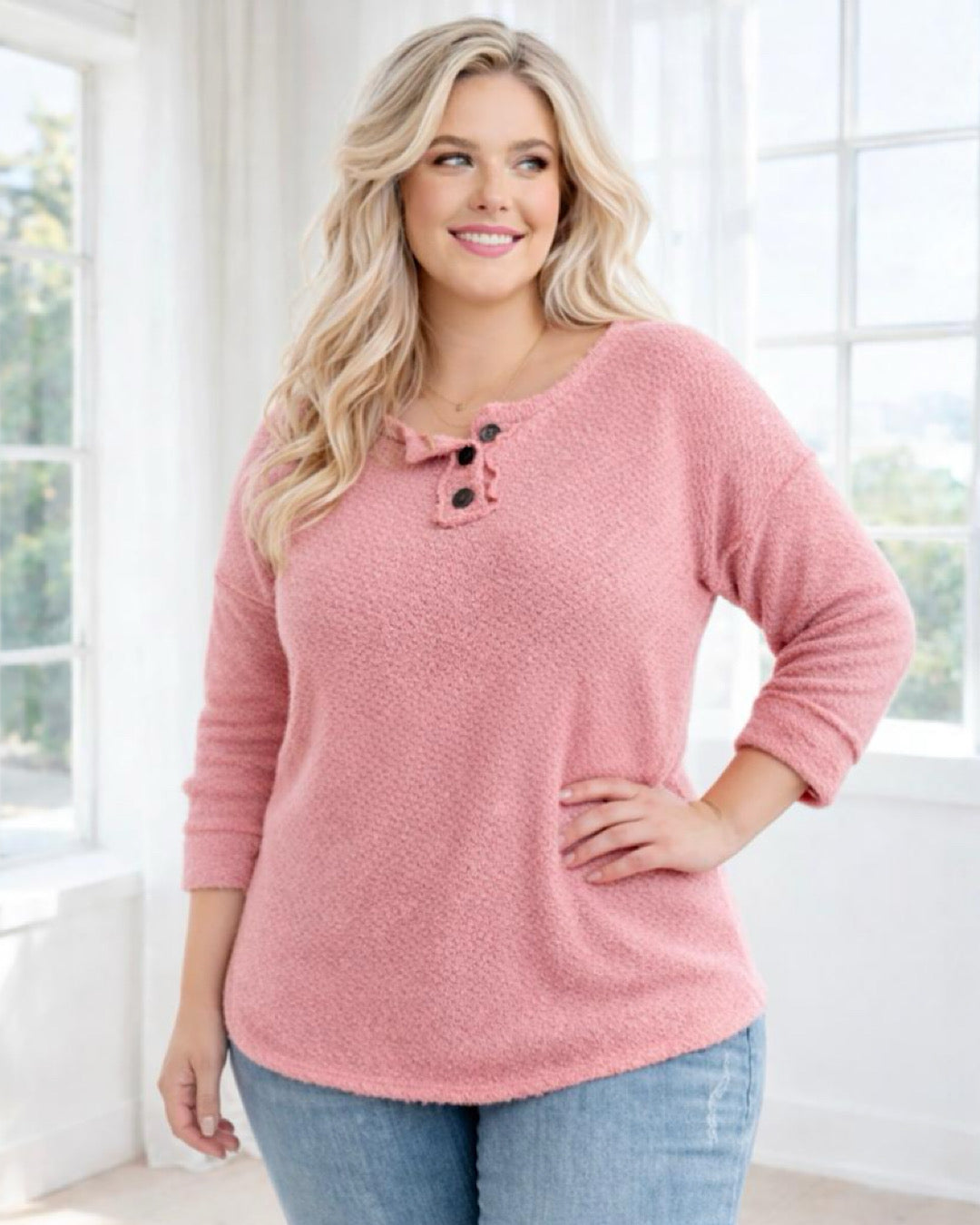 We can't wait to cuddle up on the couch with our favorite book in the Wrapped Up In Softness top! Featuring a stretchy, soft knit that shapes a henley neckline, the exposed seam detail and cozy softness make this one a must-have for spring and fall!