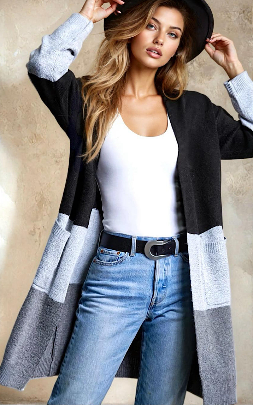 Girl, talk about effortless style!😍 This stunning black and gray colorblock cardigan brings all the cozy vibes with its soft knit and laid-back fit. The mix of black, light gray, and charcoal makes it easy to pair with literally anything—graphic tees, tanks, or your fave fall tops. Plus, those front pockets? Precious and practical!