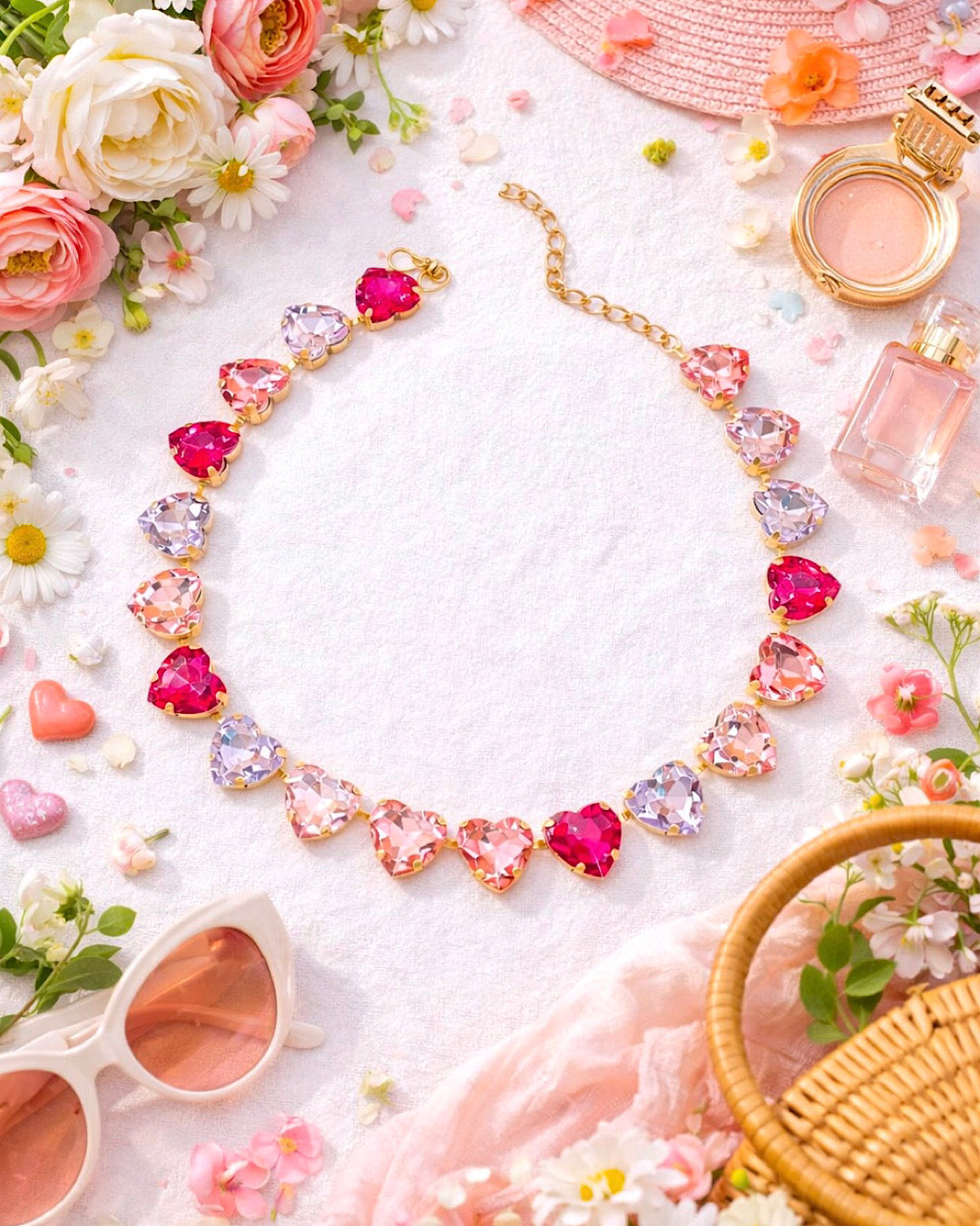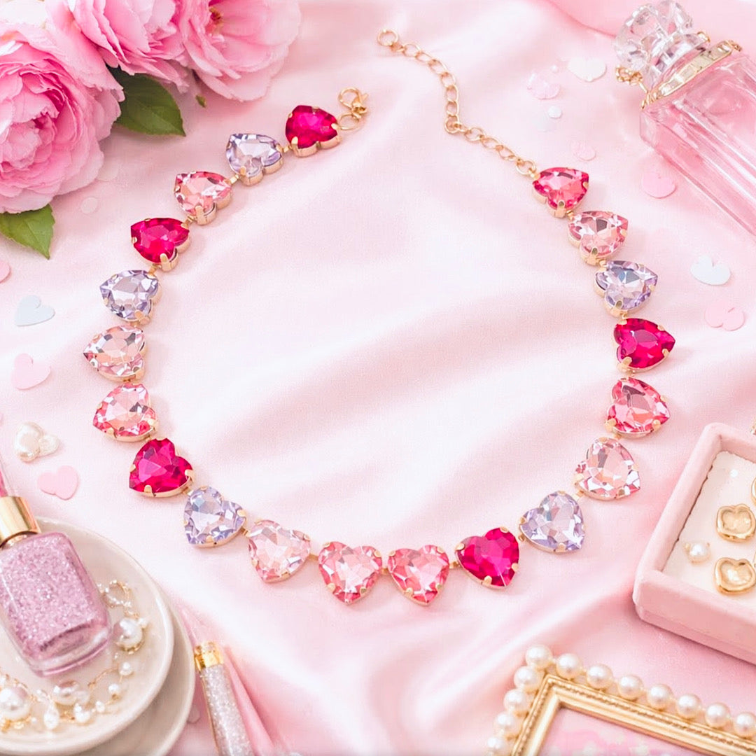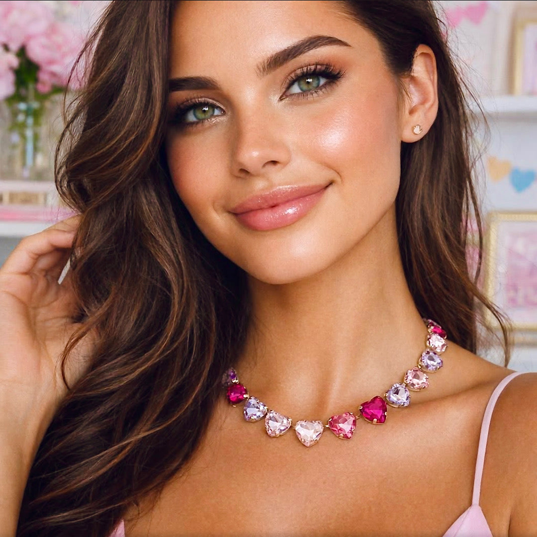 The Cotton Candy Hearts Necklace is the sweetest little statement piece, covered in heart-shaped jewels in the prettiest shades of pink, fuchsia, blush, and soft lavender! It’s the perfect spring and summer necklace to dress up a simple tee, tank, or off-the-shoulder top and add that extra shine without even trying!