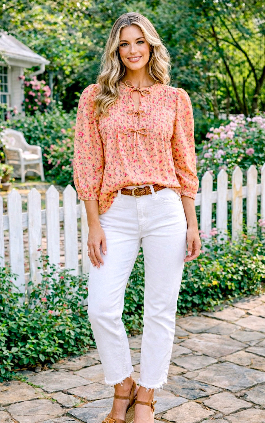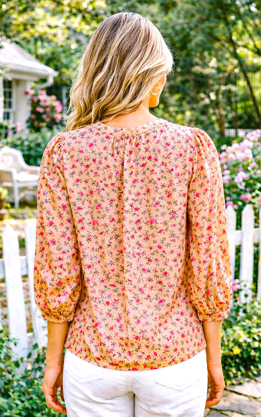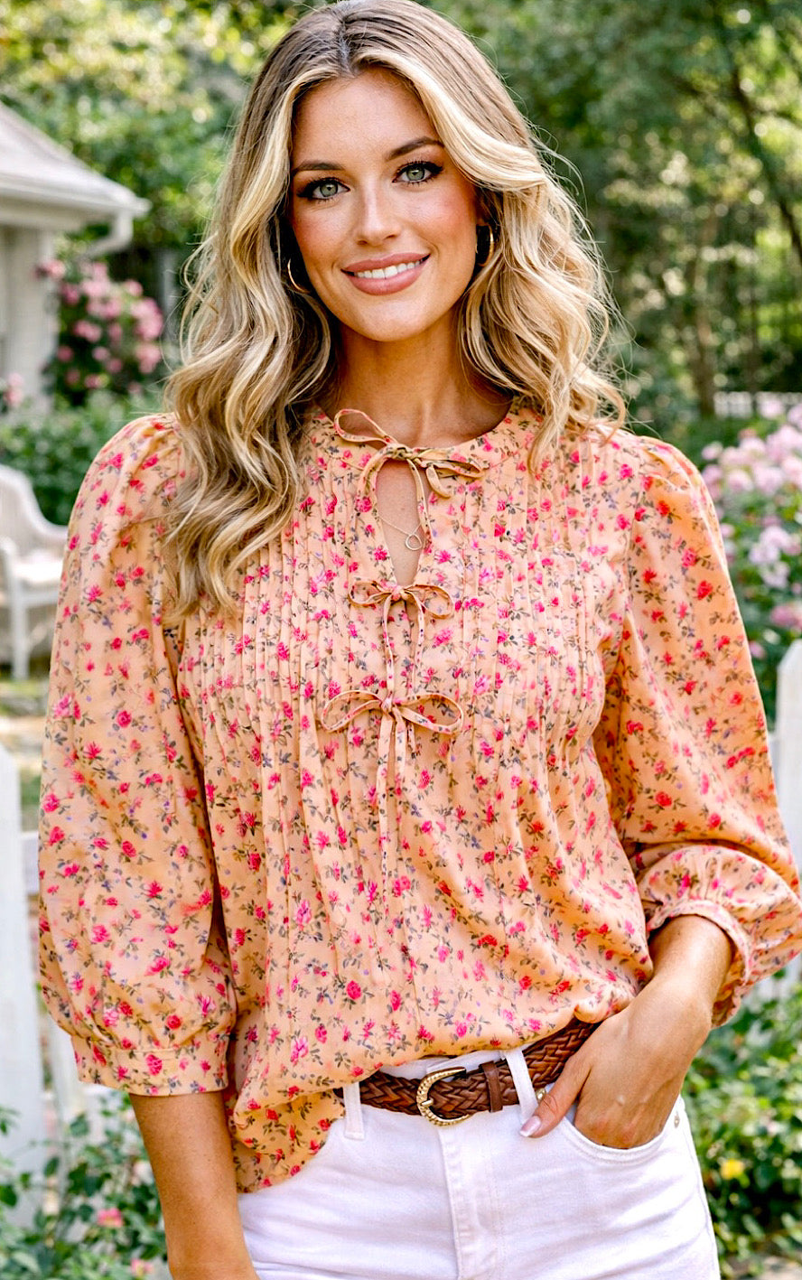 Ohhh, y’all… this one’s giving all the soft, pretty vibes we love for spring! That warm, golden floral print with pops of pink is chef’s kiss gorgeous, and the relaxed, easy fit makes it a dream to wear. The front features the sweetest pintuck pleating and three dainty bow ties at the neckline—plus a little notched V that’s juuust right (not too low, and the section between the second and third bows is sewn closed, so no peek-a-boo worries).