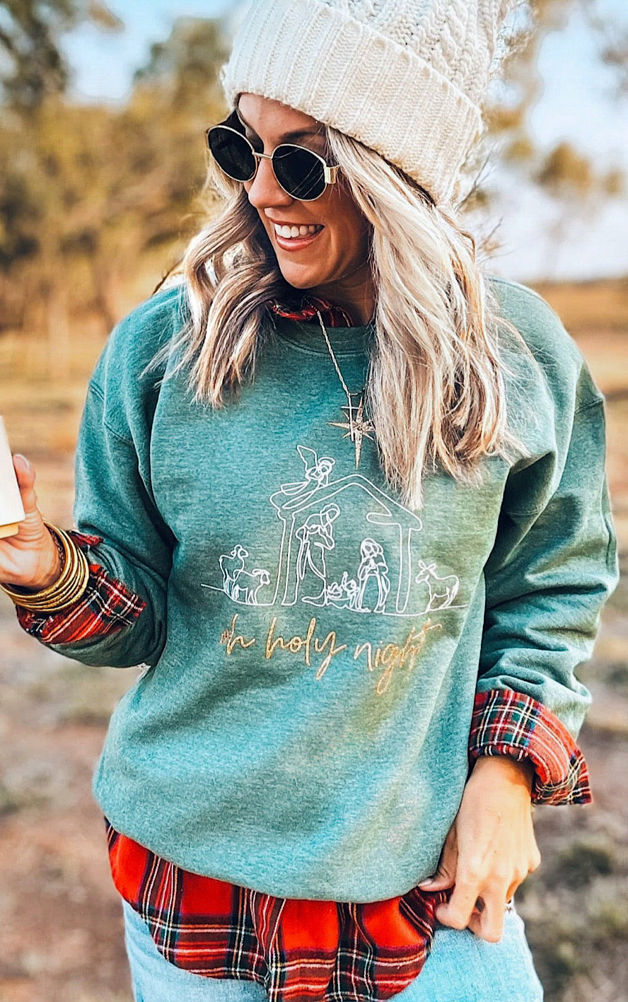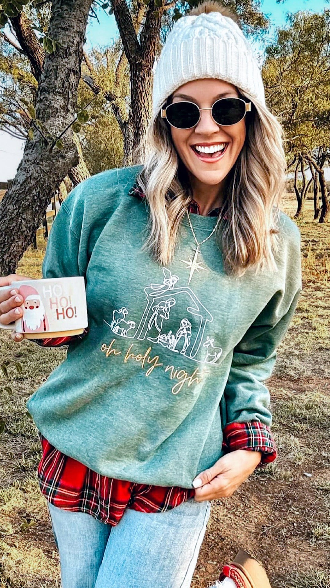 This sweatshirt just feels like Christmas, y’all. 🎄 The Oh Holy Night Nativity Sweatshirt is soft, cozy, and full of meaning — a sweet reminder of what the season’s all about. It’s professionally screen printed on a premium Gildan SoftStyle sweatshirt, so it feels amazing and holds up beautifully year after year. That golden “Oh Holy Night” lettering sparkles just enough to make it extra special. Dress it up with jeans and boots or layer it with flannel for the cutest festive look — either way, it’s pure Christmas magic!