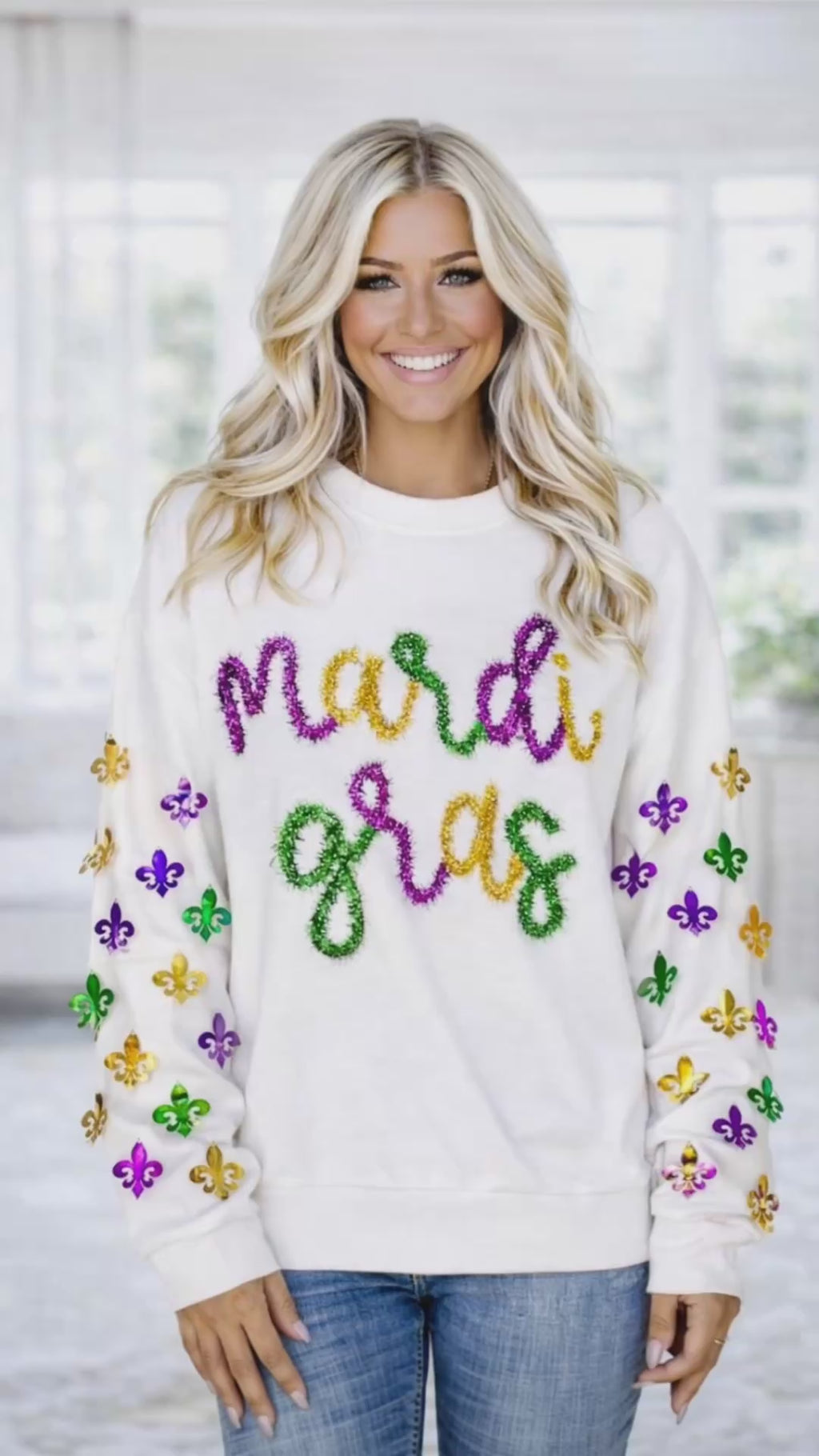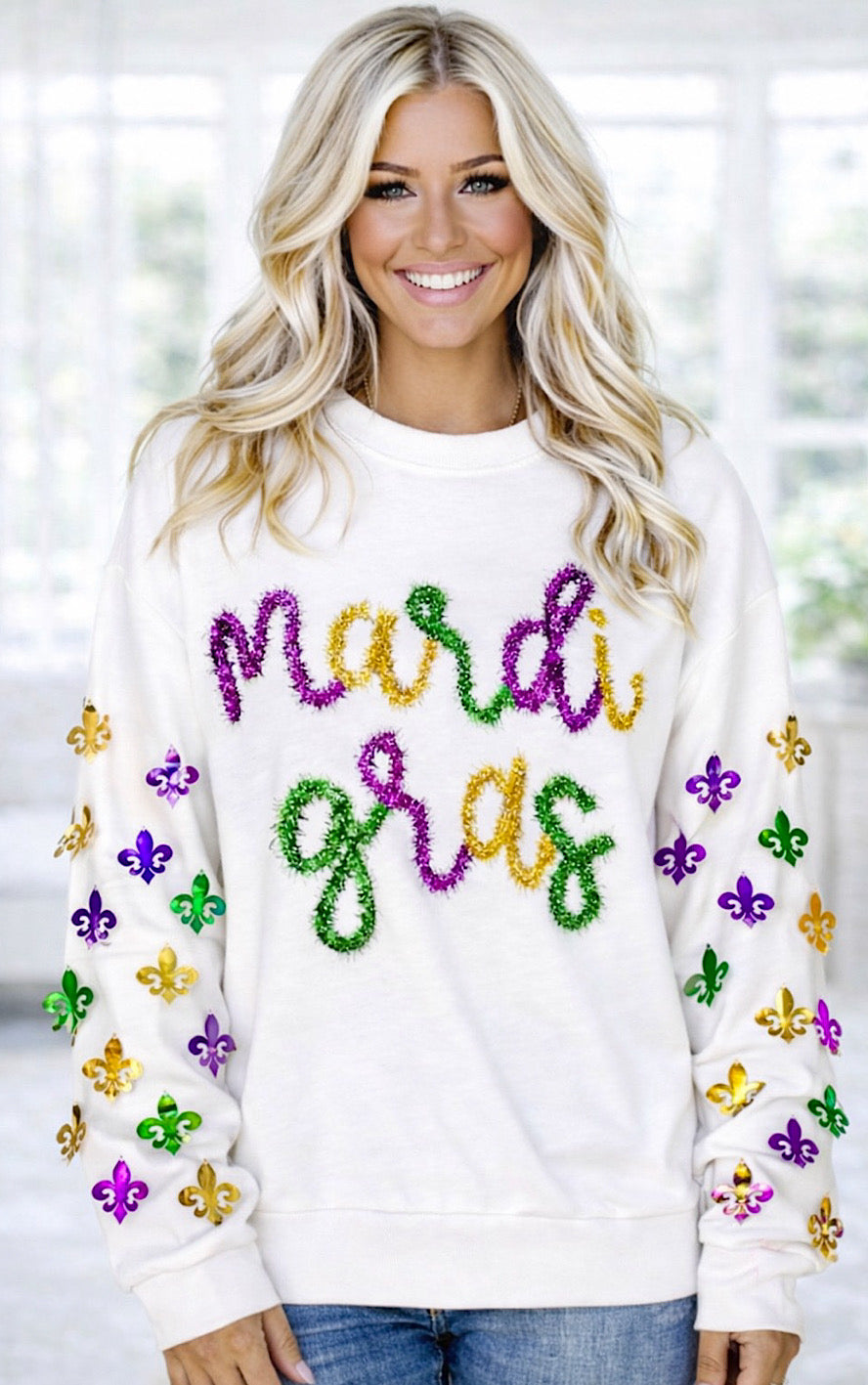 Add a touch of whimsy to your wardrobe with our Parade Princess Mardi Gras Tinsel Top! This festive sweatshirt features bold Mardi Gras tinsel lettering and the CUTEST fleur de lis charms on the sleeves! With a roomy fit, it's perfect for all your parade festivities! Let the good times roll!