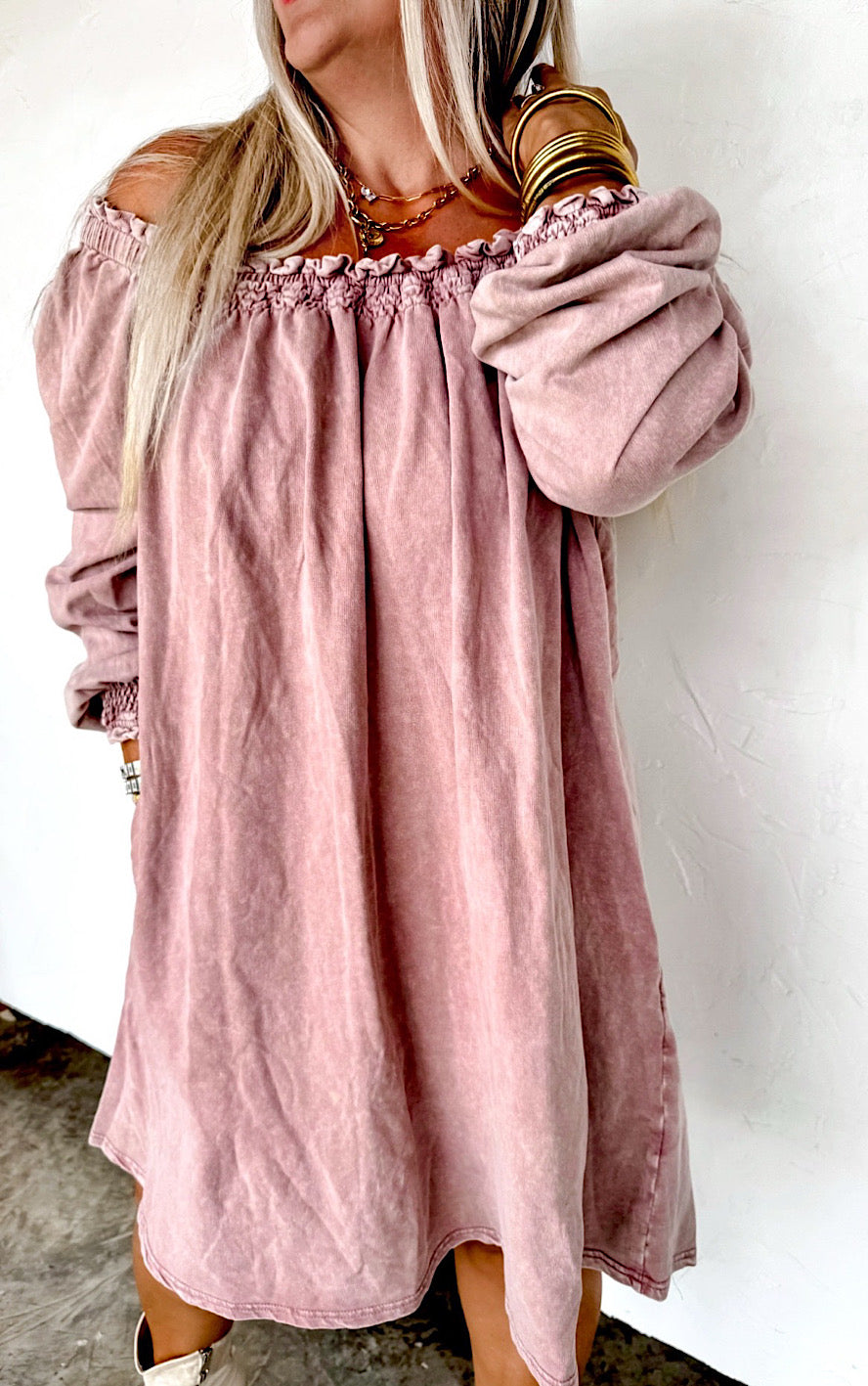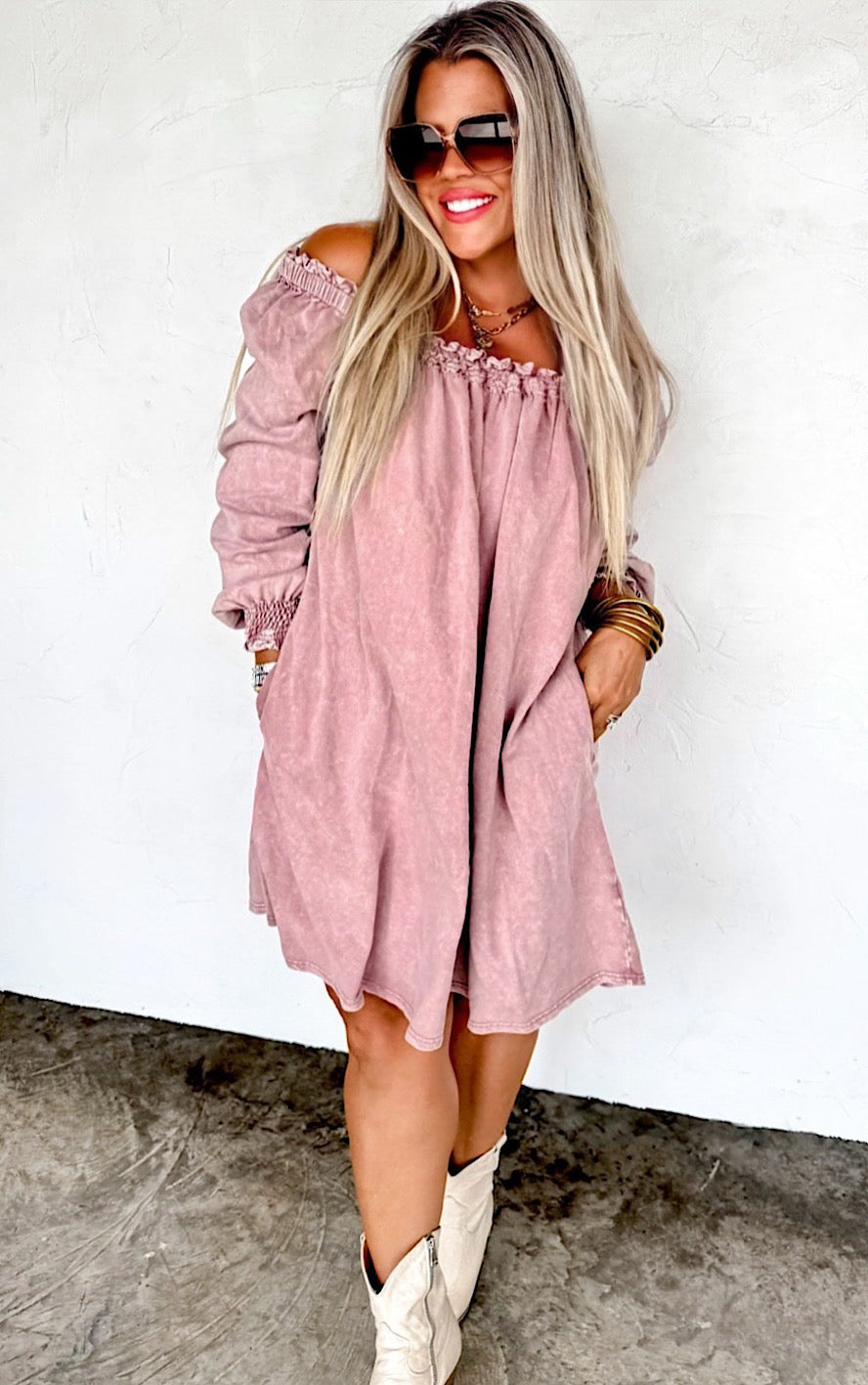 Here’s the fun part — it’s crazy versatile! Add some silver jewelry and boots and it totally gives western vibes. Or wear it with sneakers or sandals when it warms up and it looks like a whole new outfit. Seriously, it’s one of those dresses you’ll find yourself reaching for year-round.