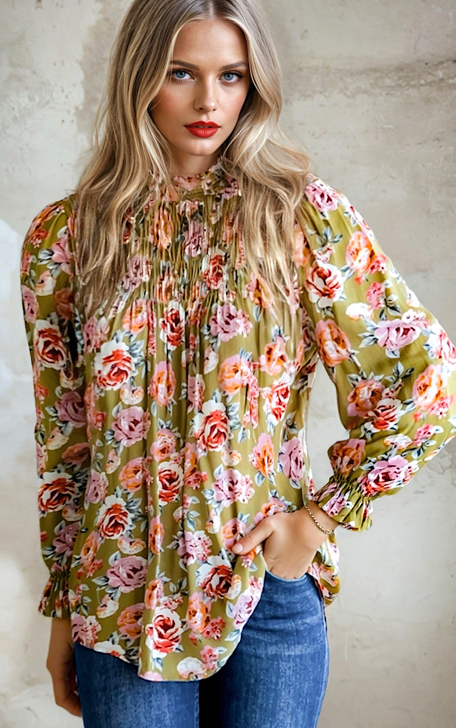 Looking for a beautiful top that transitions through all seasons? Look no further! Our Simply Lovely top is absolutely gorgeous! Featuring an olive green background with the most beautiful floral print, the smocked neckline and gathered detail on the shoulders and sleeves add a fabulous feminine touch!