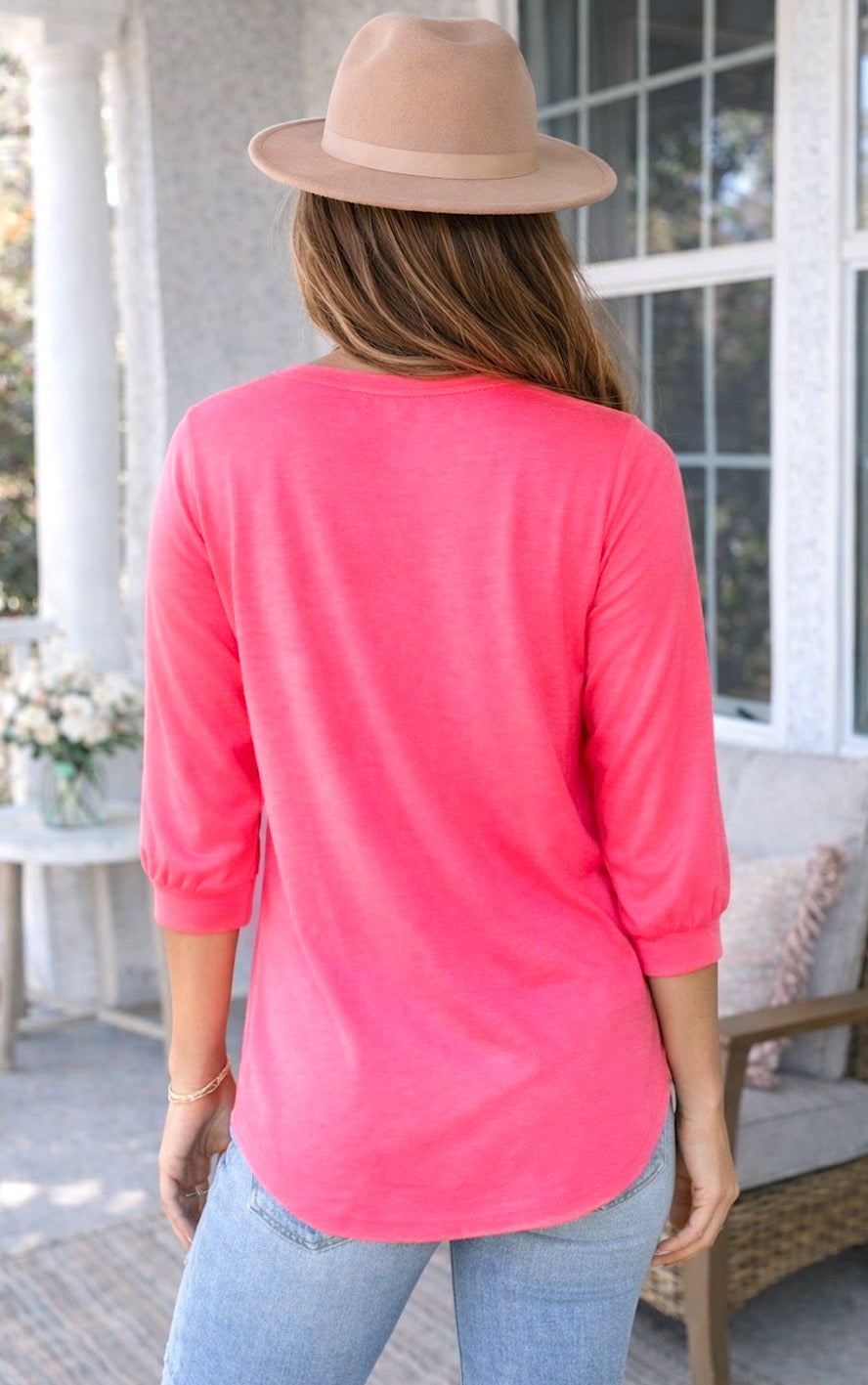 This one is one of those easy, throw-on-and-go tops that makes you look cute the second you put it on. And the color?? It’s that bold hot pink that looks SO good with a tan and just feels happy!