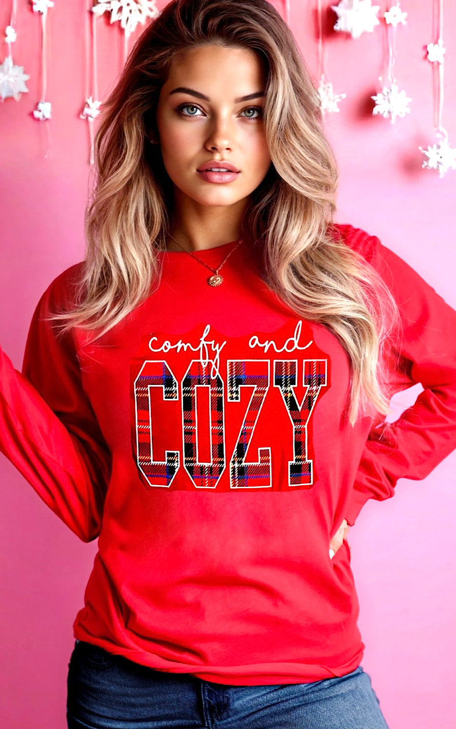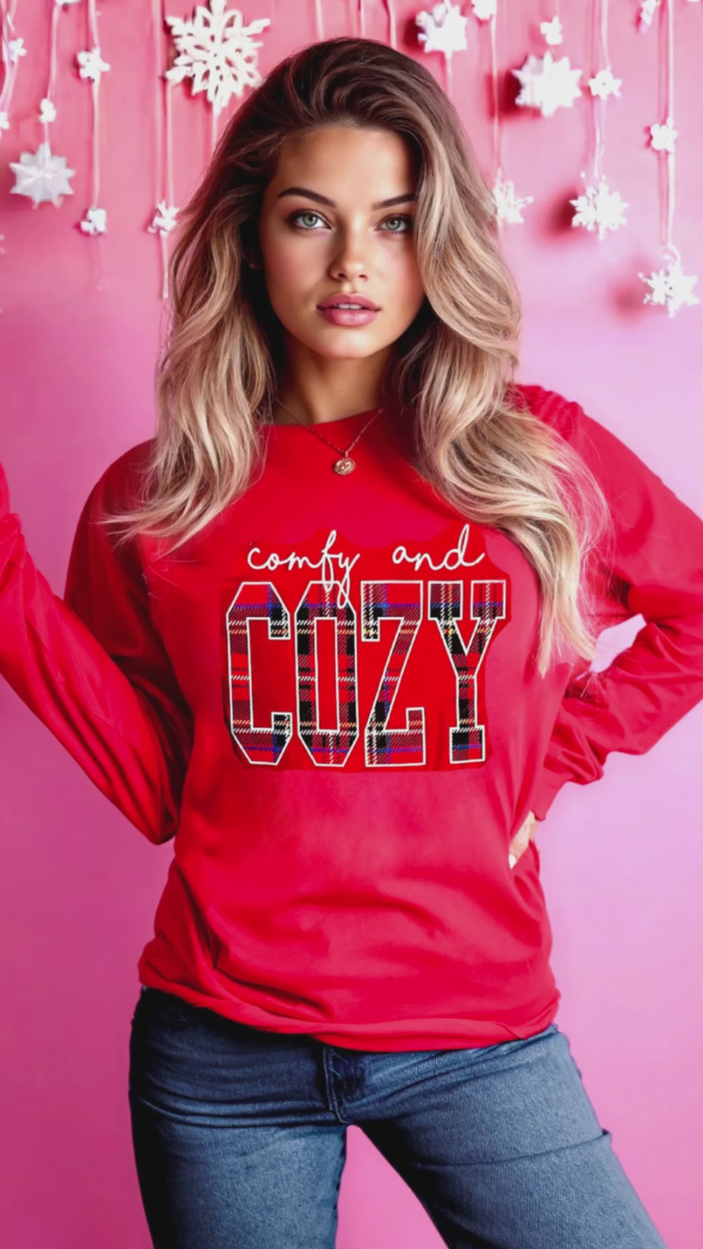 Brighten up your winter days in our red long sleeve tee with fun tartan plaid "cozy" lettering! Perfect paired with leggings or jeans (or pajama bottoms, we won't judge)!😉 Winter never looked so good!